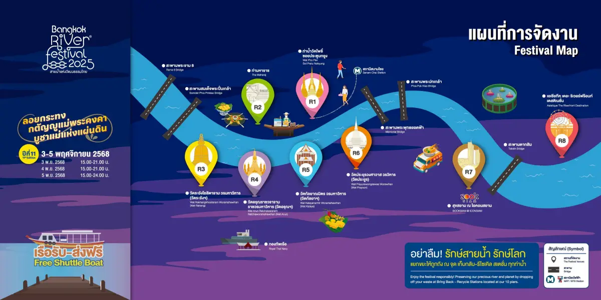 ล่องเรือฟรี 8 ท่าน้ำร่วมสมัย งาน Bangkok River Festival 2025 เทศกาลสายน้ำแห่งวัฒนธรรมไทย ปีที่ 11 “ลอยกระทงกตัญญูแม่พระคงคา บูชาแม่แห่งแผ่นดิน”