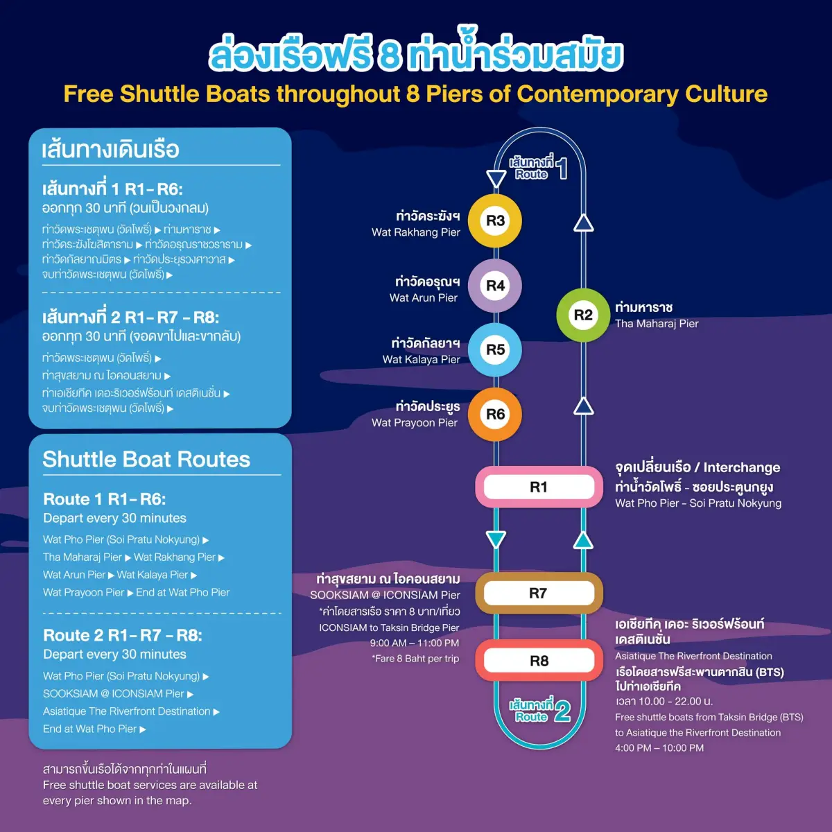 สถานที่ : 9 ท่าน้ำร่วมสมัย วัดโพธิ์, วัดอรุณฯ, วัดระฆังฯ, วัดกัลยาฯ, วัดประยูรฯ, ท่ามหาราช, เอเชียทีค เดอะริเวอร์ฟร้อนท์ เดสติเนชั่น, สุขสยาม ณ ไอคอนสยาม และคลองเปรมประชากร