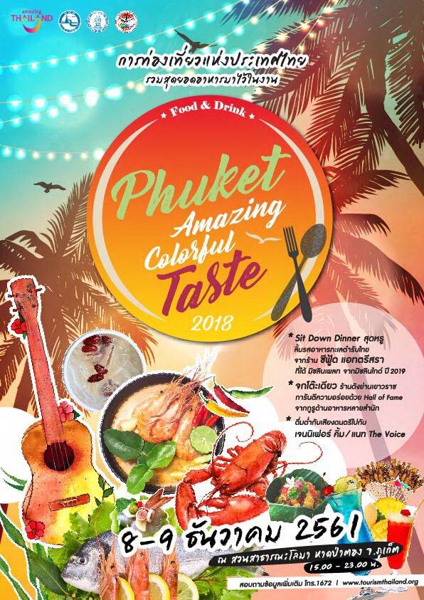 การท่องเที่ยวแห่งประเทศไทย (ททท.) ขอเชิญร่วมงานมหกรรมอาหาร Phuket Amazing Colorful Taste 2018 พบกับสุดยอดร้านอาหารทั่วไทยยกมาไว้ที่ริมหาดป่าตอง วันที่ 8 - 9 ธันวาคม 2561 ตั้งแต่เวลา 15.00 น. – 23.00 น. ณ สวนสาธารณะโลมา ป่าตอง จ.ภูเก็ต