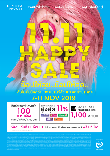 บริษัท เซ็นทรัลพัฒนา จำกัด (มหาชน) จับมือกับพันธมิตรธุรกิจ อิออน ธนสินทรัพย์ (ไทยแลนด์) ธนาคารออมสิน ธนาคารกสิกรไทย ธนาคารไทยพาณิชย์ ธนาคารธนชาต จัดแคมเปญ 11.11 HAPPY SALE ช้อปให้สุข..ช้อปให้สุด.. เอาใจขาช้อป ให้คุณได้มาขยายความสุขกับการช้อปปิ้งโปรโมชั่นแรงๆ รับลมหนาวที่ยิ่งช้อปยิ่งคุ้ม กับสินค้าแฟชั่นเสื้อผ้า เครื่องสำอางค์ เครื่องประดับ และร้านอาหารชื่อดังมากมาย ทั้งหมดกว่า 100 แบรนด์ดัง 365 ร้านค้า ภายในศูนย์การค้าของซีพีเอ็นทั้ง 11 สาขา ที่เข้าร่วมแคมเปญ
