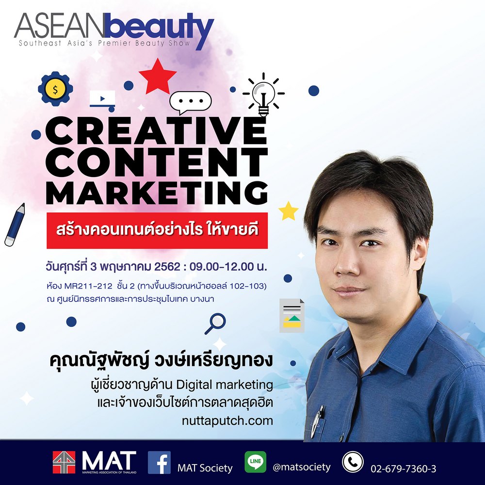 *งานสัมมนา Creative Content Marketing ในครั้งนี้ เป็นส่วนหนึ่งในงาน ASEANbeauty 2019 งานแสดงสินค้า และสัมมนาด้านความงามสำหรับภูมิภาคอาเซียน ที่จัดขึ้นระหว่างวันที่ 2-4 พฤษภาคม 2562 ณ ไบเทค บางนา พบผู้แสดงสินค้าความงามและสุขภาพจากทั่วทุกมุมโลก ที่นำเสนอสินค้าและบริการใหม่ล่าสุดครอบคลุมทุกกลุ่มผลิตภัณฑ์ พร้อมโอกาสขยายเครือข่ายธุรกิจของคุณให้ก้าวไกลกว่าที่เคยกับการจับคู่เจรจาธุรกิจ ระหว่างผู้ซื้อและผู้ออกงาน และกิจกรรมอื่นๆ มากมายตลอดงาน