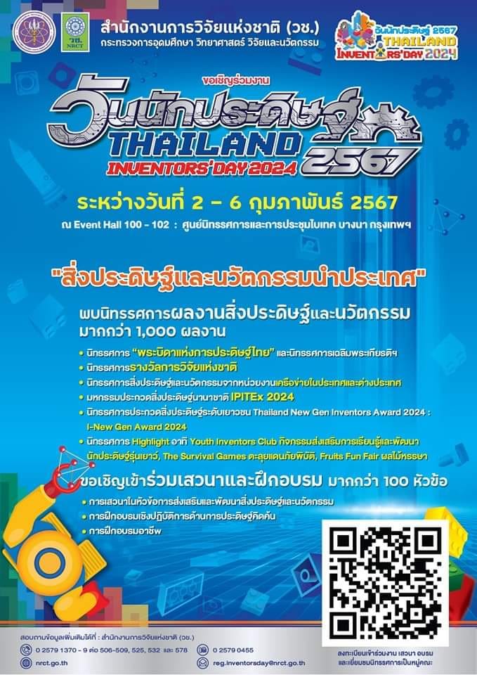 สำนักงานการวิจัยแห่งชาติ (วช.) กระทรวงการอุดมศึกษาวิทยาศาสตร์ วิจัยและนวัตกรรม จัดงานแถลงข่าวการจัดงานวันนักประดิษฐ์ และรางวัลการวิจัยแห่งชาติ ประจำปี 2567 ภายใต้แนวคิด “สิ่งประดิษฐ์และนวัตกรรมนำประเทศ” ซึ่งในปีนี้ผลงานสิ่งประดิษฐ์และนวัตกรรมมากกว่า 1,000 ผลงาน และ นิทรรศการต่าง ๆ มากมาย อาทิ เช่น นิทรรศการ “พระบิดาแห่งการประดิษฐ์ไทย” และนิทรรศการเฉลิมพระเกียรติฯนิทรรศการ รางวัลการวิจัยแห่งชาติ นิทรรศการสิ่งประดิษฐ์และนวัตกรรมจากหน่วยงานเครือข่ายในประเทศและต่างประเทศ มหกรรมประกวดสิ่งประดิษฐ์นานาชาติ IPITEx 2024 นิทรรศการประกวดสิ่งประดิษฐ์ระดับเยาวชน Thailand New Gen Inventors Award 2024 : I-New Gen Award 2024 และ นิทรรศการ Highlight Zone ที่นำมาจัดแสดงให้ผู้เข้าชมได้ร่วมสนุกและเรียนรู้ไปกับกิจกรรมต่างๆ มากมายถึง 14 จุด