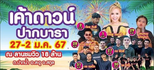 ขอเชิญเที่ยวงาน เคาท์ดาวน์ ปากบารา จัดงานระหว่างวันที่ 27 ธันวาคม 2566 - 2 มกราคม 2567 ณ บริเวณลานชมวิว 18 ล้าน ตำบลปากน้ำ อำเภอละงู จังหวัดสตูล
