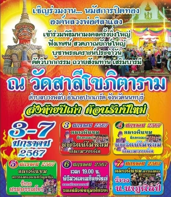 ขอเชิญเชิญร่วมงาน นมัสการ ปิดทอง องค์หลวงพ่อศิลาแลง เข้าร่วมพิธีมหามงคลครั้งยิ่งใหญ่ ฟังเทศน์ สวดภาณยักษ์ใหญ่ บูชาพระเคราะห์ประจำวัน ตัดวิบากกรรม ถวายสังฆทาน เสริมบารมี ระหว่างวันที่ 3 - 7 มกราคม 2567 ณ วัดสาลีโขภิตาราม ตำบลบางพลับ อำเภอปากเกร็ด จังหวัดนนทบุรี