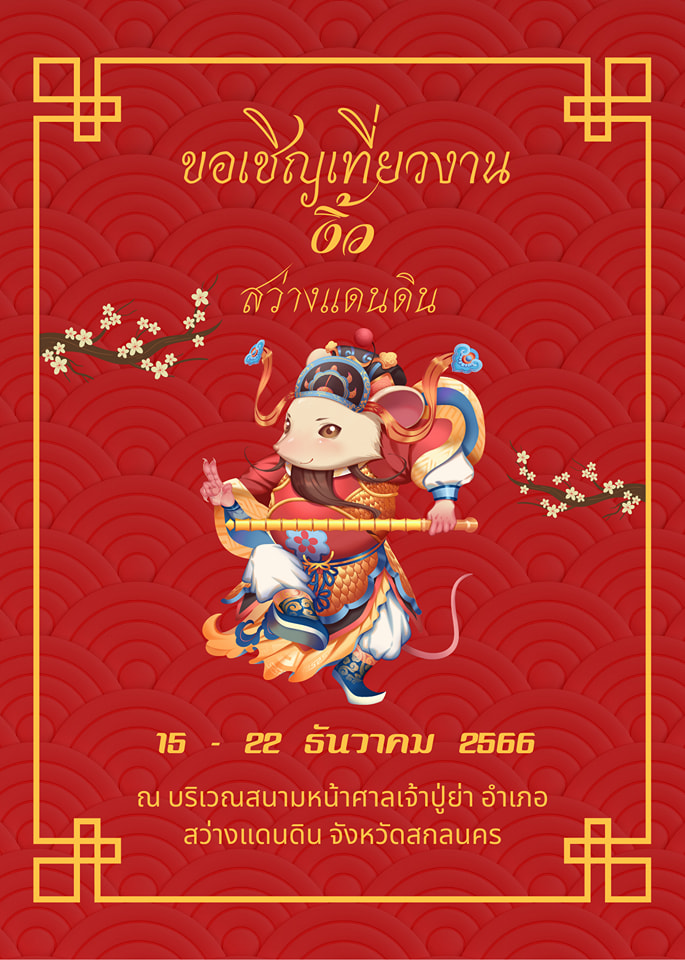ขอเชิญเที่ยวงาน งิ้วสว่างแดนดิน ระหว่างวันที่ 15 - 22 ธันวาคม 2566 ณ บริเวณสนามหน้าศาลเจ้าปู่ย่า อำเภอสว่างแดนดิน จังหวัดสกลนคร