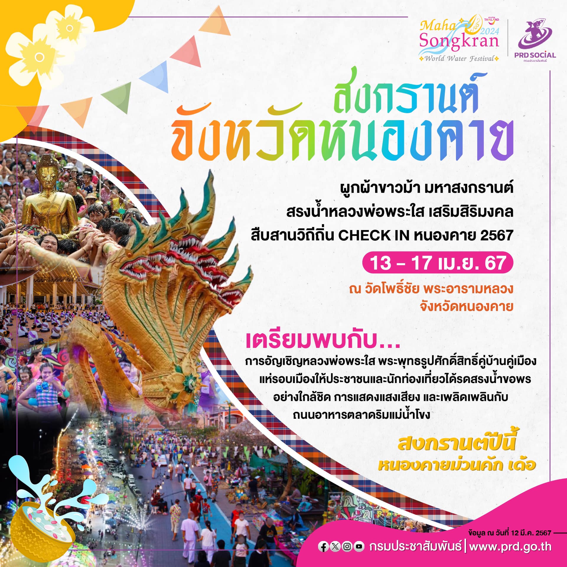 ผูกผ้าขาวม้า มหาสงกรานต์ สรงน้ำหลวงพ่อพระใส เสริมสิริมงคล สืบสานวิถีถิ่น CHECK IN หนองคาย 2567 ระหว่างวันที่ 13 - 17 เมษายน 2567