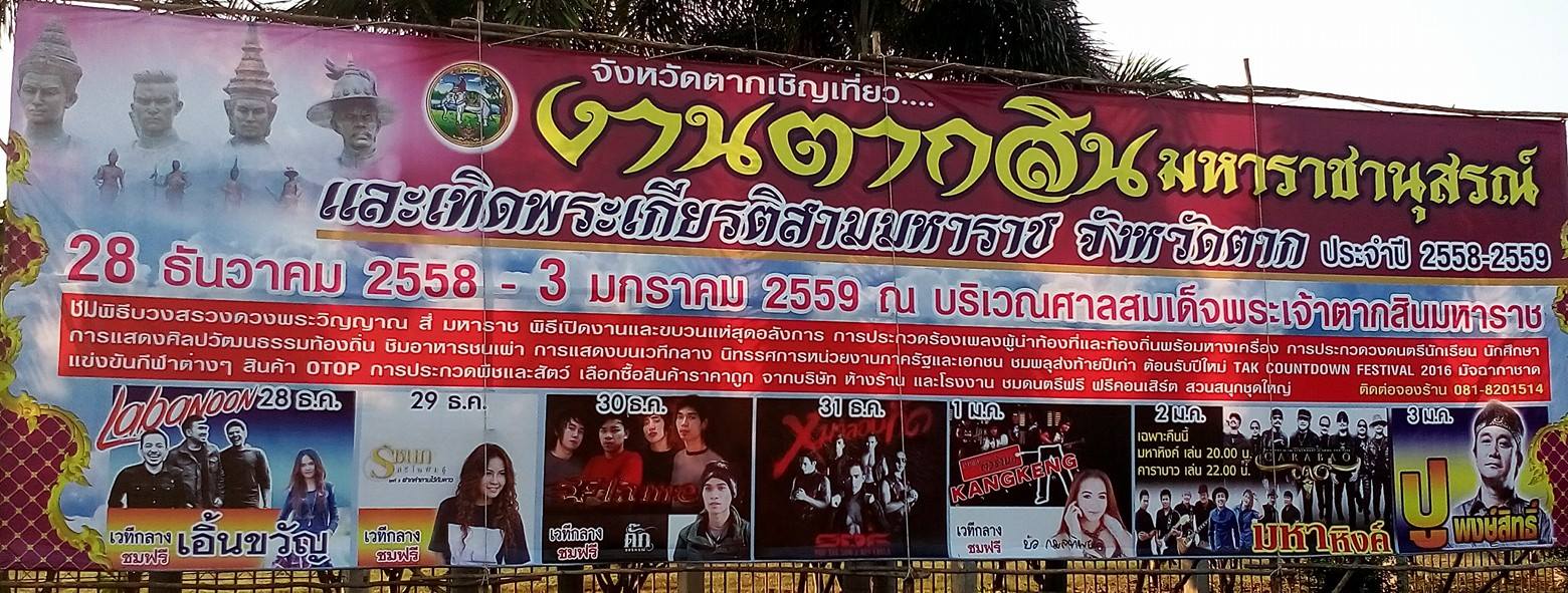 - พิธีเปิดงานตากสินมหาราชานุสรณ์และเทิดพระเกียรติสามมหาราช จังหวัดตาก ประจำปี 2558-2559 เวลา 18.00 น. เป็นต้นไป