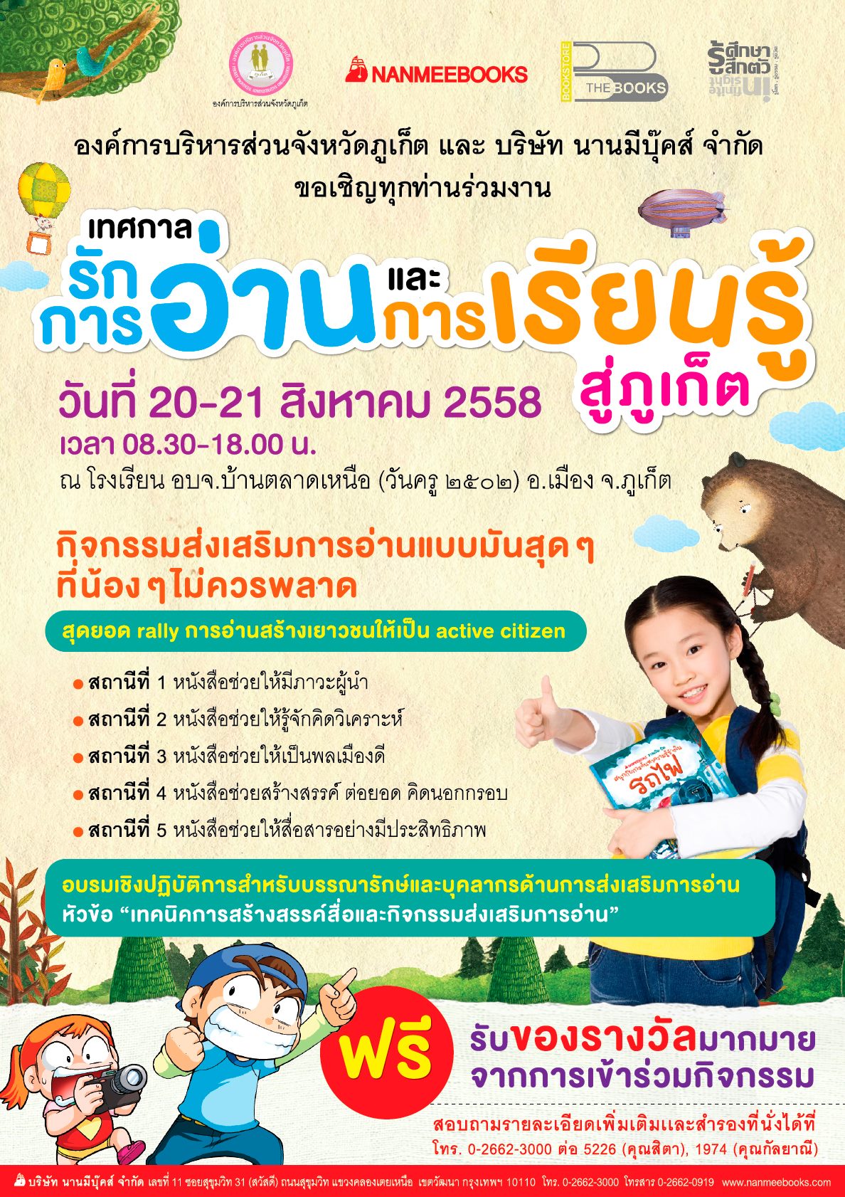 นานมีบุ๊คส์ ร่วมกับองค์การบริหารส่วนจังหวัดภูเก็ต ขอเชิญชาวภูเก็ต และโรงเรียนจังหวัดใกล้เคียง ร่วมงาน "เทศกาลรักการอ่านและการเรียนรู้ สู่ภูเก็ต" พบกับกิจกรรมส่งเสริมการอ่าน�
