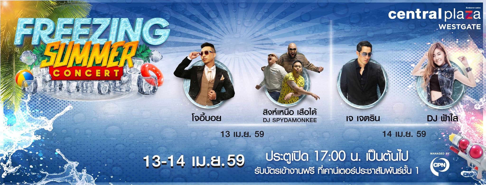 สงกรานต์นี้ชวนมาสาดความมันส์ ดับความร้อน ในคอนเสิร์ต "Freezing Summer Concert" วันที่ 13 เมษายน 2559 พบกับ "โจ้ - อภิสิทธิ์ โอภาสเอี่ยมลิขิต" หรือ "โจอี้ บอย" และ "สิงห์เหนือเสือใต้" วันที่ 14 เมษายน 2559 พบกับ "เจ - เจตริน วรรธนะสิน" และ "ดีเจ ฟ้าใส" รับบัตรเข้างานฟรีที่ เคาน์เตอร์ประชาสัมพันธ์ ชั้น 1 ศูนย์การค้าเซ็นทรัลพลาซา เวสต์เกต